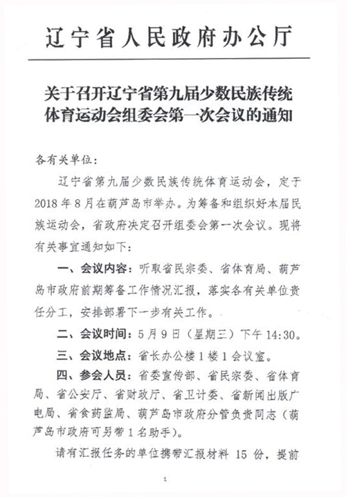 关于召开辽宁省第九届少数民族传统体育运动会组委会第一次会议的通知