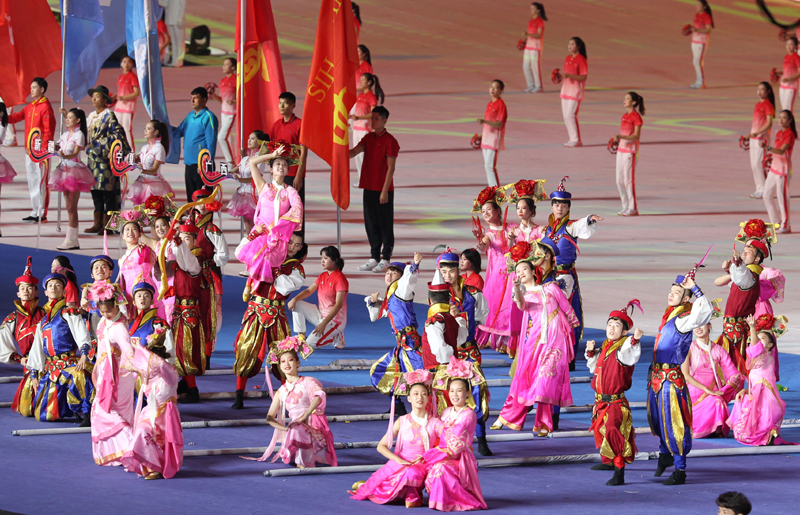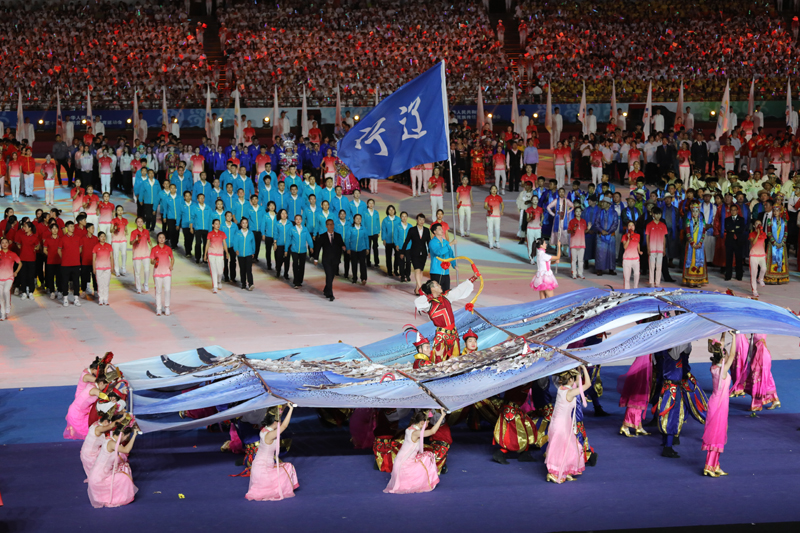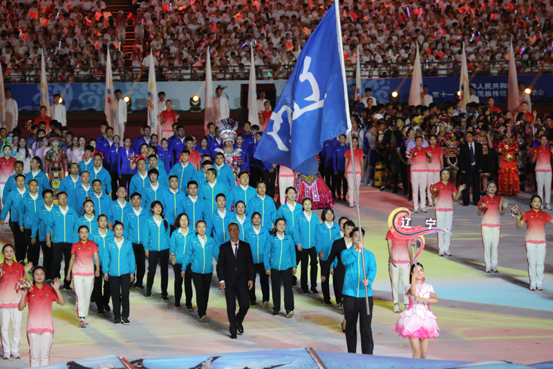 开幕式入场仪式中,辽宁健儿精神饱满地走过主席台,在驻停区进行满族舞蹈表演。韵味悠长、特点鲜明的满族舞蹈艺术,不仅展现了满族人民悠久的历史文化,也展现了满族人民的劳动生活、风俗习惯和审美追求,引起现场阵阵掌声。
