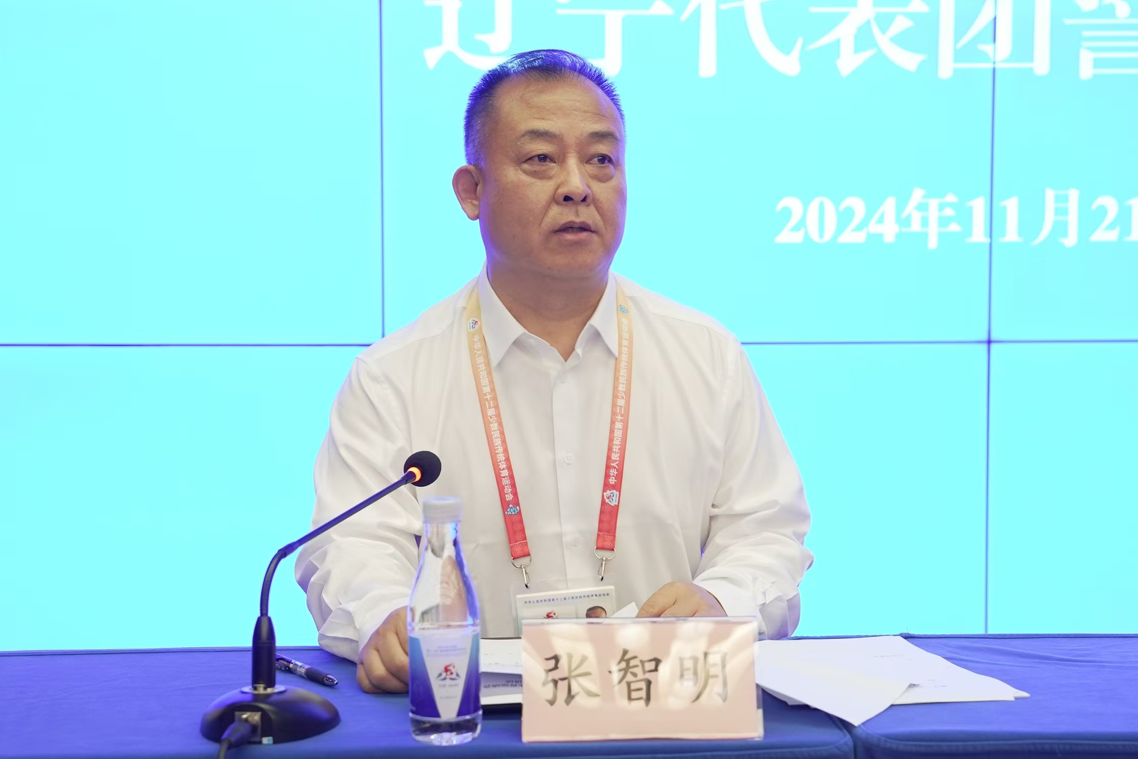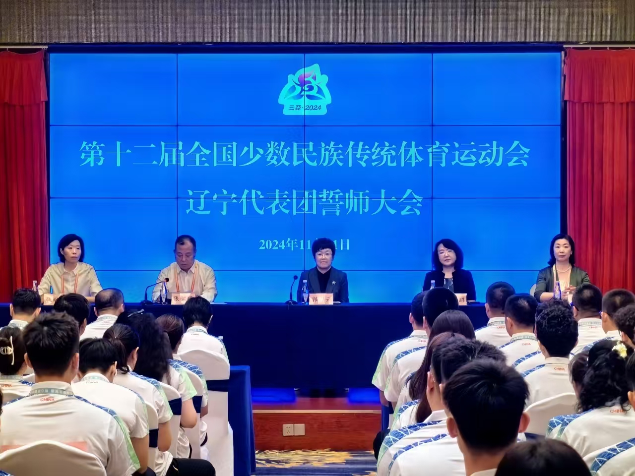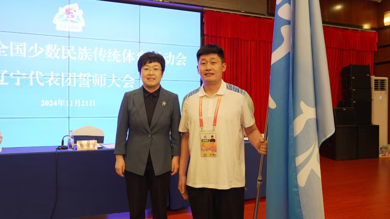 11月21日,第十二届全国少数民族传统体育运动会辽宁代表团誓师大会在海南省三亚市君达海景酒店举行。辽宁省政府副省长郭彩云出席会议并讲话,省委统战部副部长、看动漫 党组书记、主任张智明主持会议。